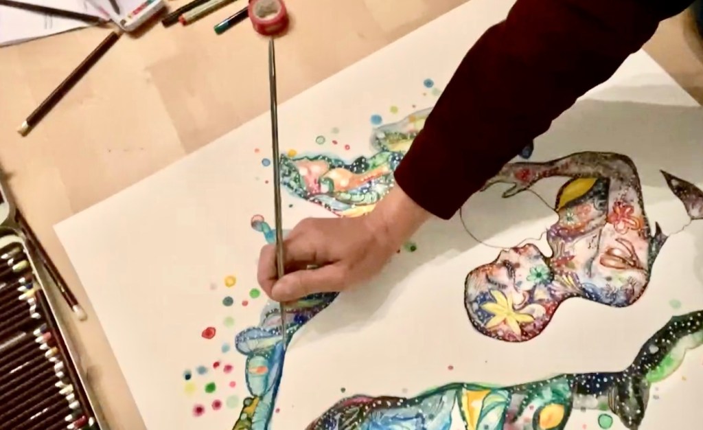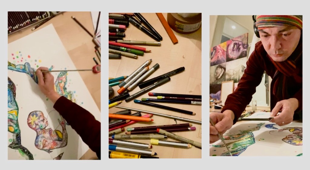 Walk With Me the drawing: pencils,ink,gouache & watercolors on paper 60x50cm; A warm embrace under a gate of colorful lush shapes: a kiss on the head. The gate on the drawing consists of two parts, green, yellow ,blue and white-the colors represent the green feeling, slightly tropical. Never had I imagined I’d be using my own perfume ‘Walk With Me ‘ designed for house of Annindriya as a vessel into my visual world on paper .